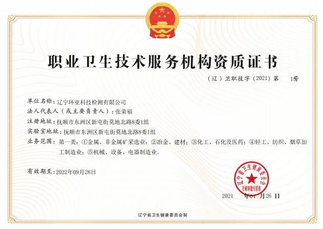 遼寧環(huán)亞科技檢測有限公司秉承“公平、公正、客觀、真實”的服務理念,力求為遼寧省各企事業(yè)等用人單位提供更優(yōu)質(zhì)的服務,公司領導率領全體員工歷時一年零八個月的時間操練各項基本技能,于2016年8月9日取得了(遼)安職技字(2016)第B-0019號《職業(yè)衛(wèi)生技術服務機構(gòu)資質(zhì)證書》